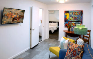 Connie’s Place Unit 1 is located in the heart of the Sedona Arts District and is the perfect rental unit for 2 people. The Bedroom features a king bed, a nice bathroom with a bath/shower, small refrigerator, coffee maker, and a microwave. This unit has a TV in the living room area and bedroom. It is decorated in a delightful Mid-century modern style. Connie’s Place is, of course, pet-friendly, with no pet fees. Unit 1 is perfectly suited for a 1 small to medium size pet. Cleaning is upon check-out only..
